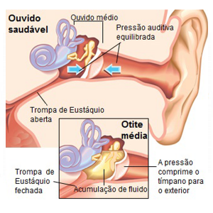 A orelha média é ventilada pela tuba auditiva, canal que liga a orelha média a rinofaringe (fundo do nariz). Quando há algum fator que obstrui a tuba auditiva ocorre o acumulo de secreção na orelha média a qual não consegue ser drenada, tornando-a um ambiente propício à proliferação de vírus e bactérias.